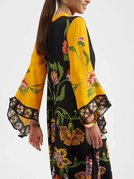 Exquisite Floral Print Draped Waterfall Sleeves Maxi Dress