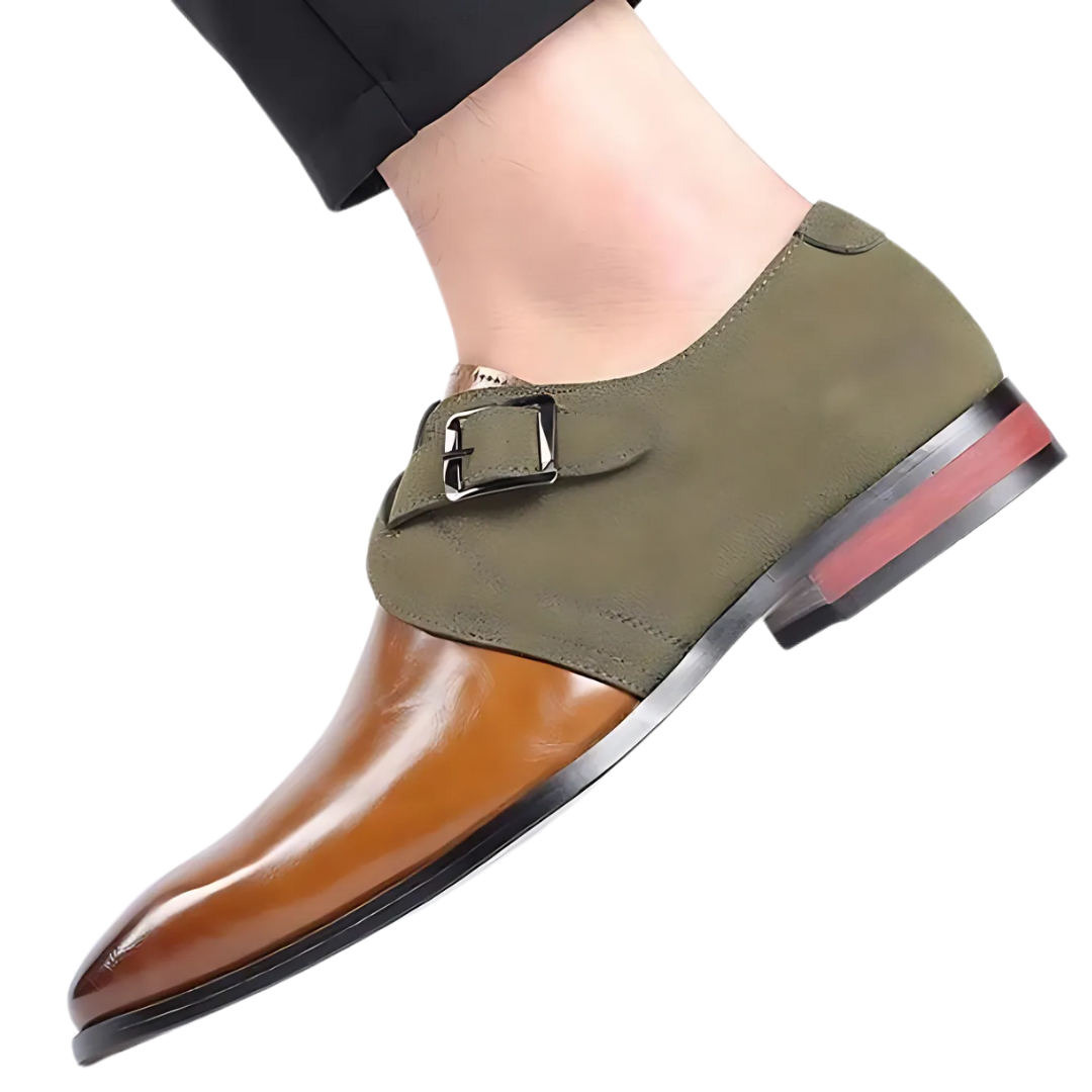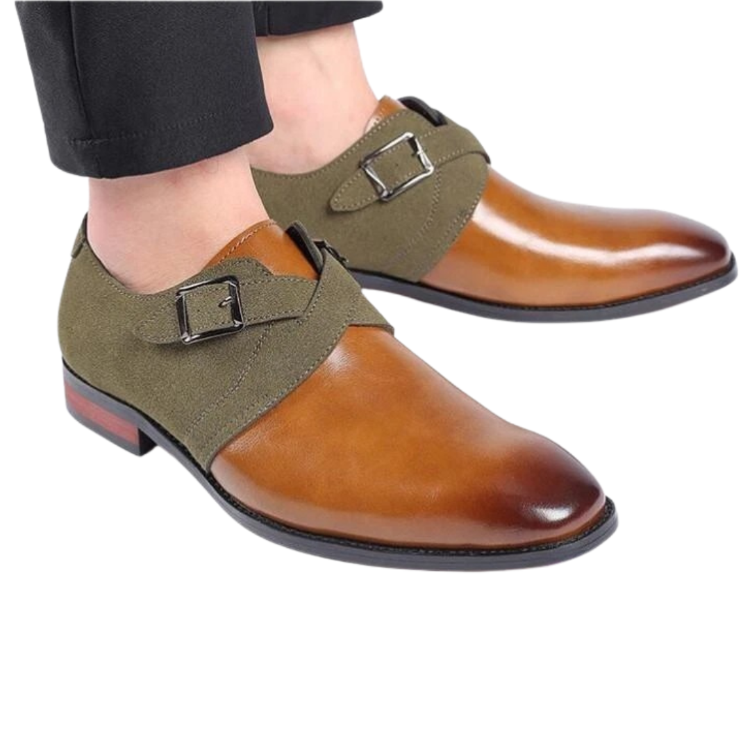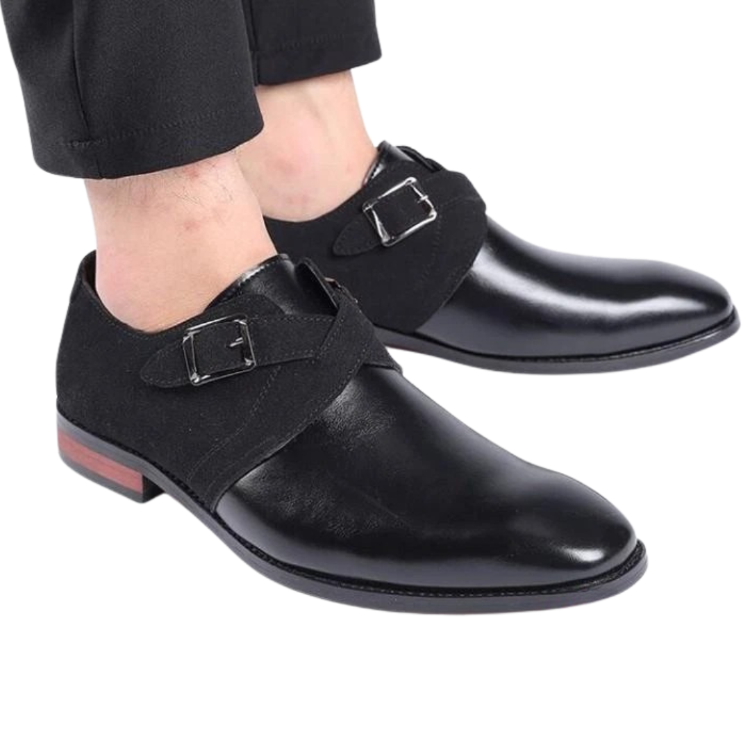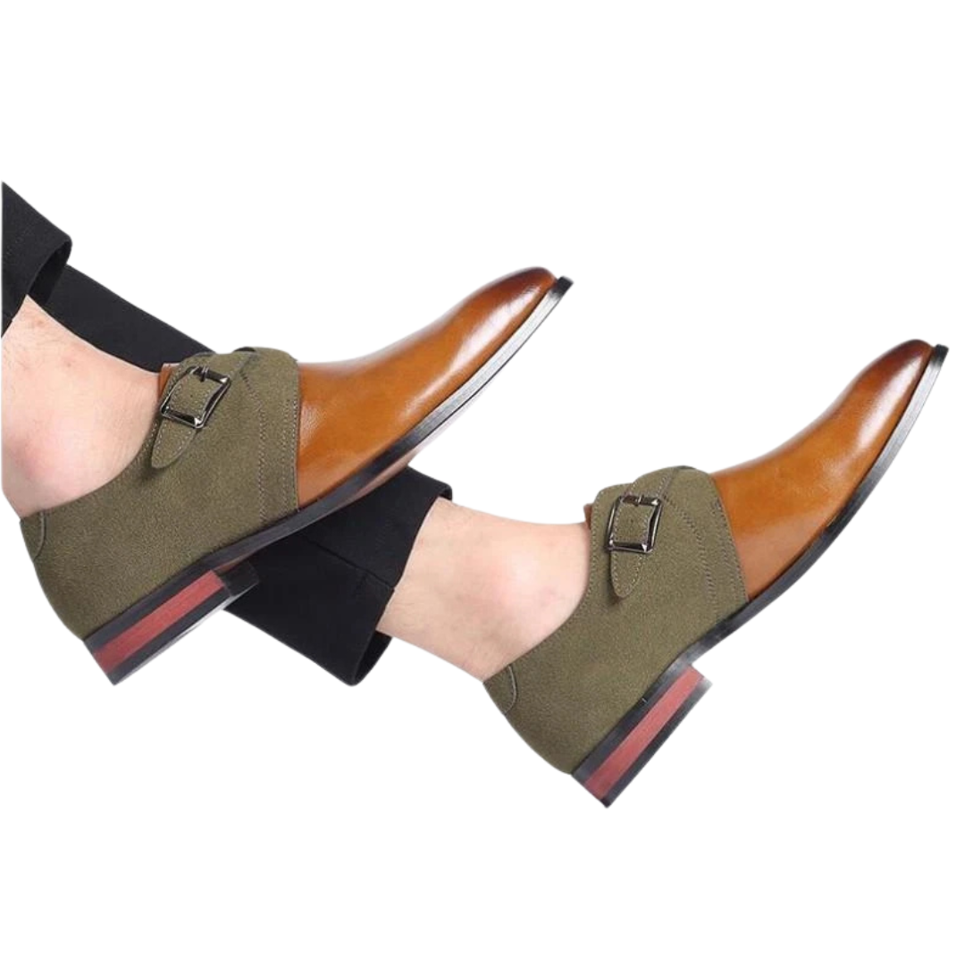 Featuring a dual-tone suede and premium vegan leather upper, these loafers offer a striking contrast of texture and depth. The double buckle design adds a timeless, distinguished touch, while the cushioned insole ensures superior comfort for all-day wear. Finished with a high-polish sheen, these shoes exude luxury, making them perfect for the office, formal occasions, and upscale events.